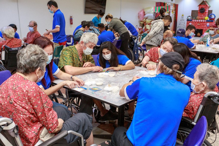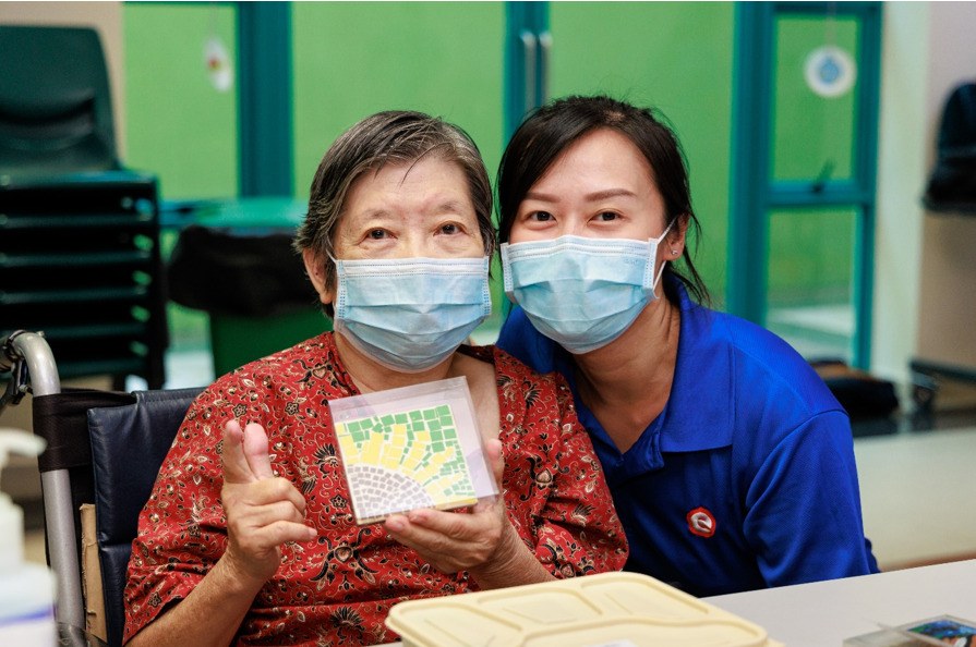 Elderly residents joyfully engage in a hands-on mosaic tile-making session, creating art and cherished memories alongside the Extra Space Asia staff.