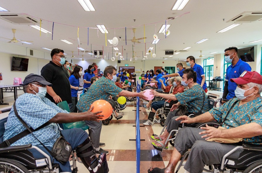 Cheerful moments unfold as elderly residents participate in a spirited game of balloon badminton, sharing laughter and camaraderie with the Extra Space Asia team.