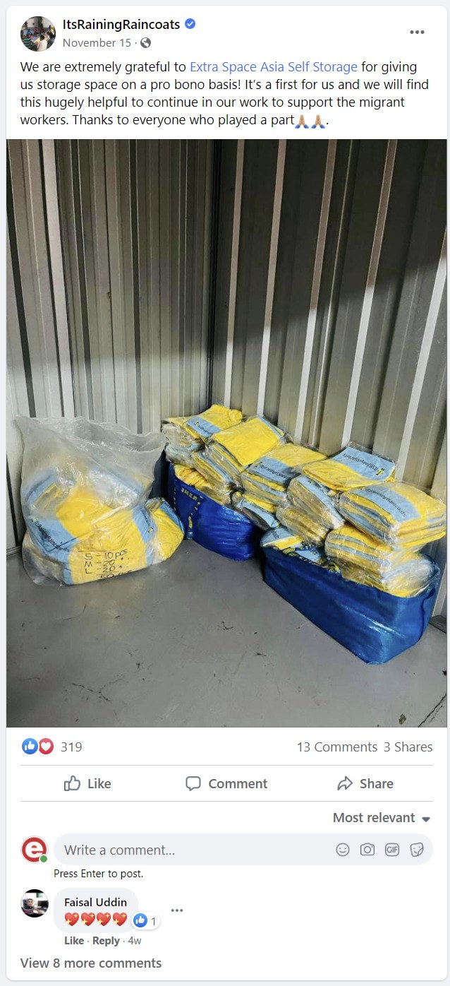 At Extra Space Asia Self Storage, we care about the community we work and live in. We are glad to be able to work alongside ItsRainingRaincoats (IRR) to support their meaningful cause by sponsoring the use of our storage unit. With the newly added storage space, IRR will also bring in more items such as raincoats and home appliances to help our migrant worker community without worrying about the lack of space. ItsRainingRaincoats (IRR) is a social initiative set up in 2015 to raise awareness for migrant worker welfare. IRR also aims to improve the lives of migrant workers in Singapore by strengthening their integration into our community, city and country. They have also employed different strategies to help improve the quality of workers’ lives and make them feel valued, appreciated, safe and welcome in Singapore. Learn more about ItsRainingRaincoats (IRR) here.